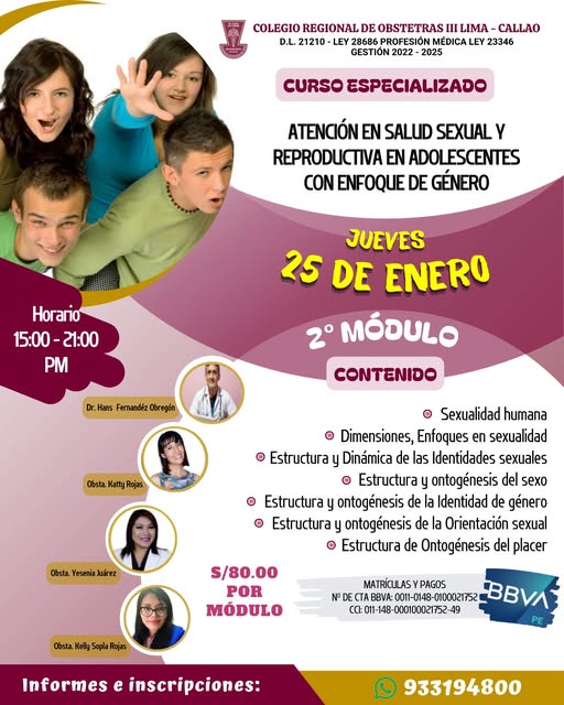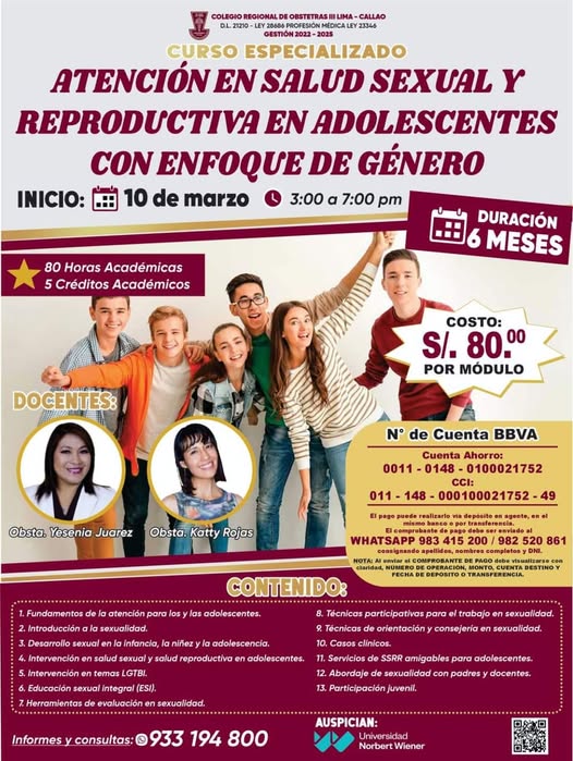 Obstetras, los invitamos a participar del Curso Especializado: "ATENCIÓN EN SALUD SEXUAL Y REPRODUCTIVA EN ADOLESCENTES CON ENFOQUE DE GÉNERO".