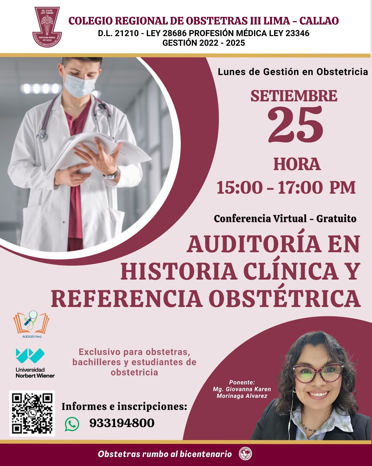 Estará a cargo de Giovanna Kareen Morinaga Alvarez, Obstetra Auditora de la Oficina de Seguros HMA. Directora de Audiges Perú.